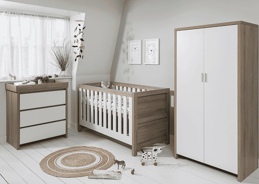 The Tutti Bambini Modena Double Nursery Wardrobe in White and Oak is a beautifully designed piece that combines classic oak finishes with modern white detailing, perfect for any contemporary nursery. This wardrobe is thoughtfully crafted to store all your baby’s essentials, offering ample storage and advanced safety features.